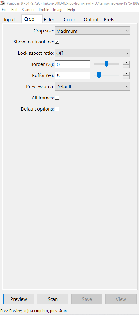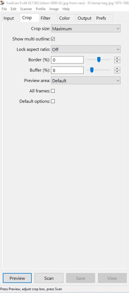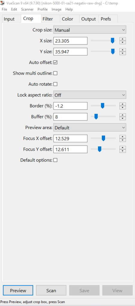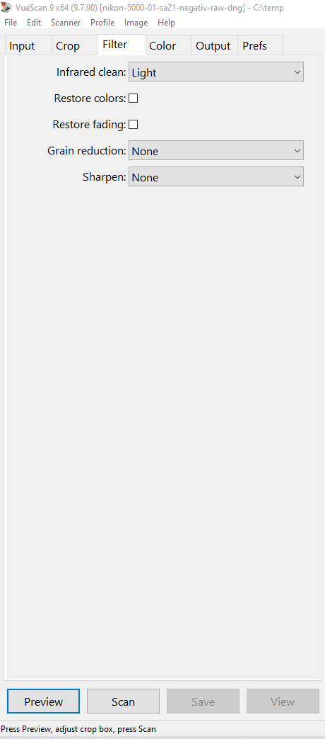Suggested Vuescan settings for scanning negative strips to RAW with Nikon Coolscan and the SA-21 strip film adapter.