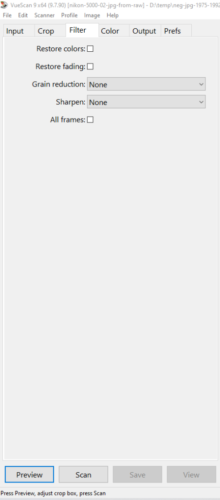 In the second step you make jpg files directly from the RAW files. If you want to try other settings you can change the settings and “rescan” the RAW files. If the films are in good shape this will give a fine result.
