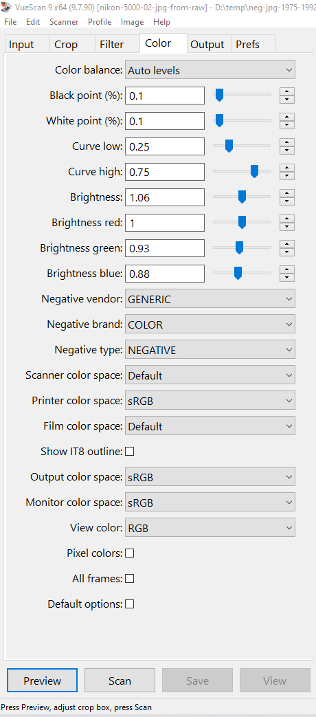 It can be difficult to get the right colors from negatives. Especially old negatives. If you only want to scan your negatives one time you can scan to Vuescan “RAW” file. A Vuescan “RAW” file is the raw CCD data from the scanner. You can then re-process these files with different settings in Vuescan without having to actually scan the image again.