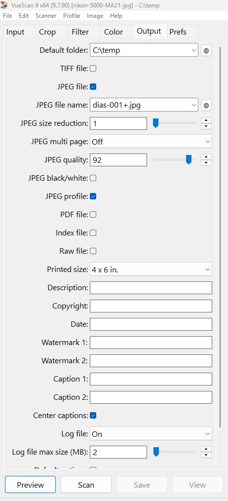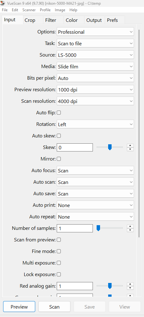 Suggested settings for scanning single slides to JPG with Nikon Super Coolscan 5000 and the MA-21 slide adapter. Similar settings can be used for Nikon Coolscan IV (LS-40), V (LS-50) and 4000. These settings are for use with Vuescan 9.7.90. Other versions have similar settings.
