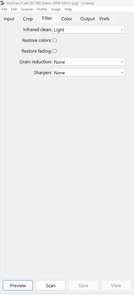 The infrared dust removal can perceive dark areas and spots on Kodachrome film as dust and will therefore incorrectly try to correct this, making dark parts a little more gray. If the images are in glass frames, the advantage of dust removal will usually outweigh the disadvantage. However, if the images are in glassless frames, you can choose to manually blow them clean of dust and scan without infrared dust removal. Select the Filter tab, Infrared Cleaning = “None”. This does not apply to all Kodachromes, if necessary, do a test scan with and without “Infrared Cleaning”.