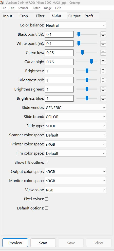 Nikon Coolscan, Vuescan settings for slides